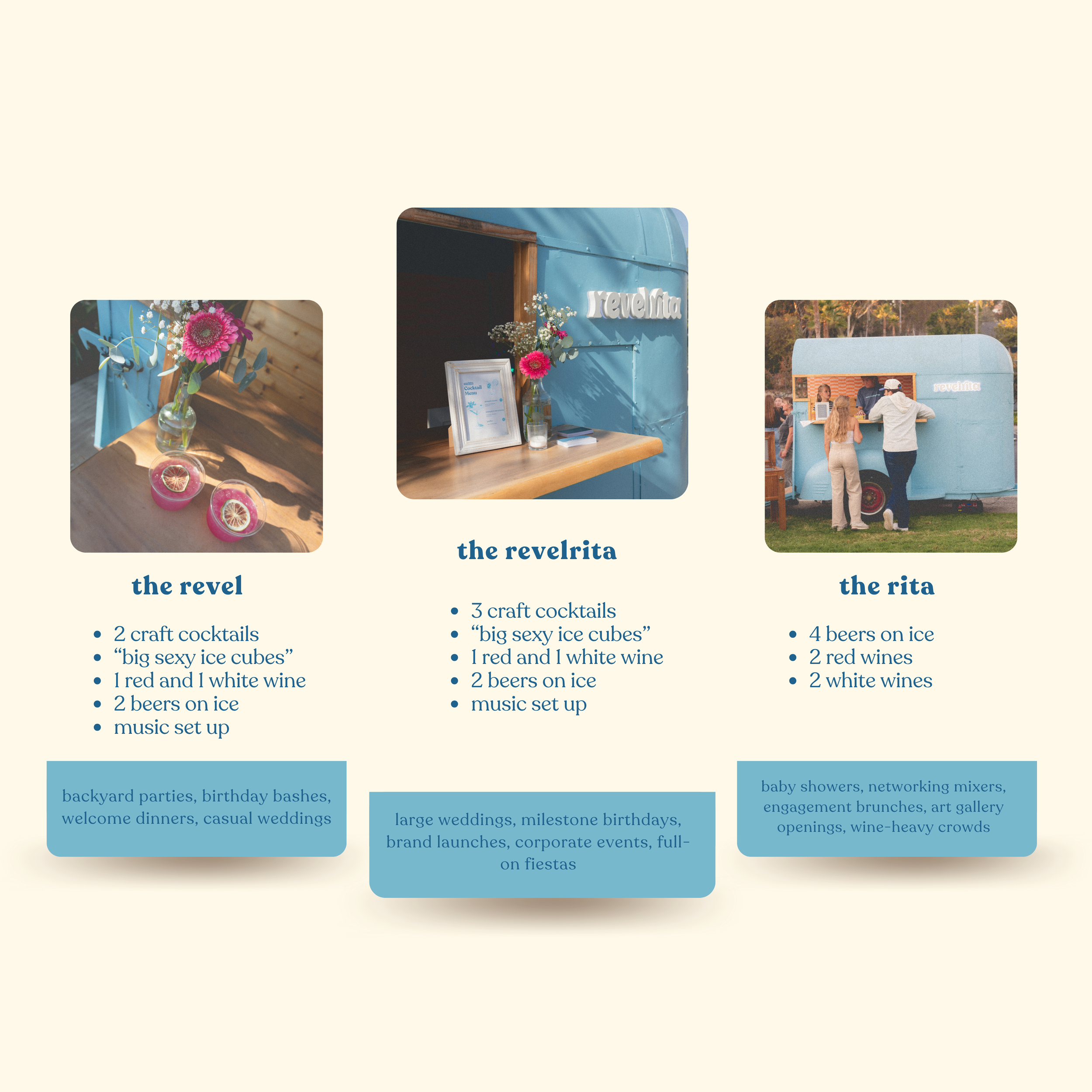your final quote will include everything: the revelrita service + the alcohol cost, so you know exactly what you’re paying for. we'll make sure you're stocked just right—no overspending, or not having nearly enough. the prices below are the starting amounts for each package. the other variables will be the size of your event and the alcohol selection.